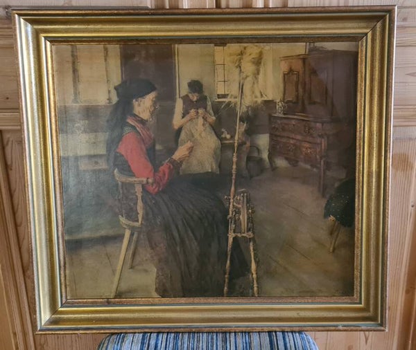 „Die Spinnerin“ wird in der kunsthistorischen Bildrezension als Wendepunkt im Schaffen Wilhelm Leibls (1844-1900) angesehen. Dieses querformatige Bild, auch „In der Spinnstube“ betitelt, wurde von ihm 1892 fertiggestellt, womöglich noch vor Leibls Umzug von Aibling nach Kutterling. Hier bei meinem Angebot handelt es sich um einen Kunstdruck. Rahmen und Bild sollten gereinigt werden.